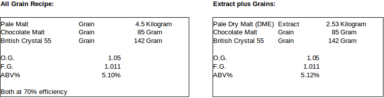 The only difference is the use of 2.53kg of DME to replace the 4.5kg Pale Malt in the all-grain recipe. The projected outcome for both recipes is the same mathematically, although taste could vary, but that's largely due to the brewer. The Extract recipe will be much easier to brew. It requires less equipment and time because you don't need to conduct a full 45-60 minute mash and sparge of 4.73kg of grain – instead you just steep the grains (227g) in water, directly in the kettle for 20 mins then boil and add the DME. That saves you some time, but the saving in effort from having less equipment to clean and sanitise makes it so much more enjoyable; unless you like cleaning.